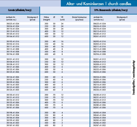 Bestellen Sie bitte per E-Mail die aktuelle Altarkerzen-Preisliste mit Abmessungen